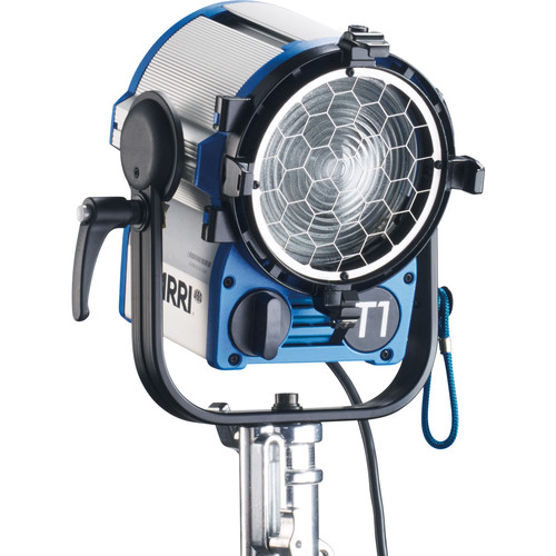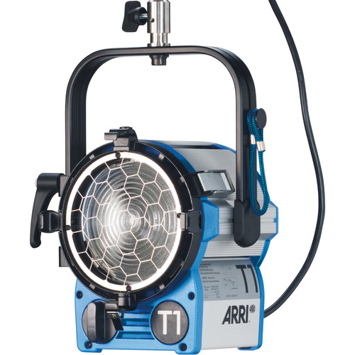 The True Blue T1 1000W Pole-Operated Fresnel Fixture from ARRI offers a cross-cooling system that reduces the temperature of the lamp housing and lens. It features a stainless steel friction disc for rigid lock-off, adjustable 2- and 4-scrim position brackets, stainless steel lens protection with maximized light transmission, and high temperature stability. The fixture includes a 4.9' cable, 4-leaf barndoors, and a filter frame.