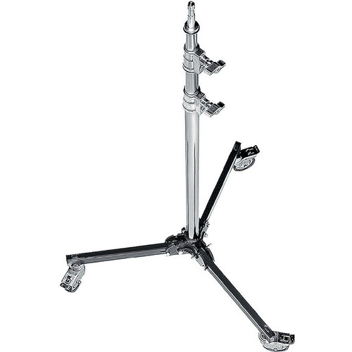 The 8' Avenger Roller Stand 17 with Folding Base is a heavy-duty, chrome-plated, steel and aluminum alloy support that features a low base for extra stability, braking wheels, two risers, and a 5/8" Baby stud. The legs fold up for transport and storage. It will support 26.5 lb.