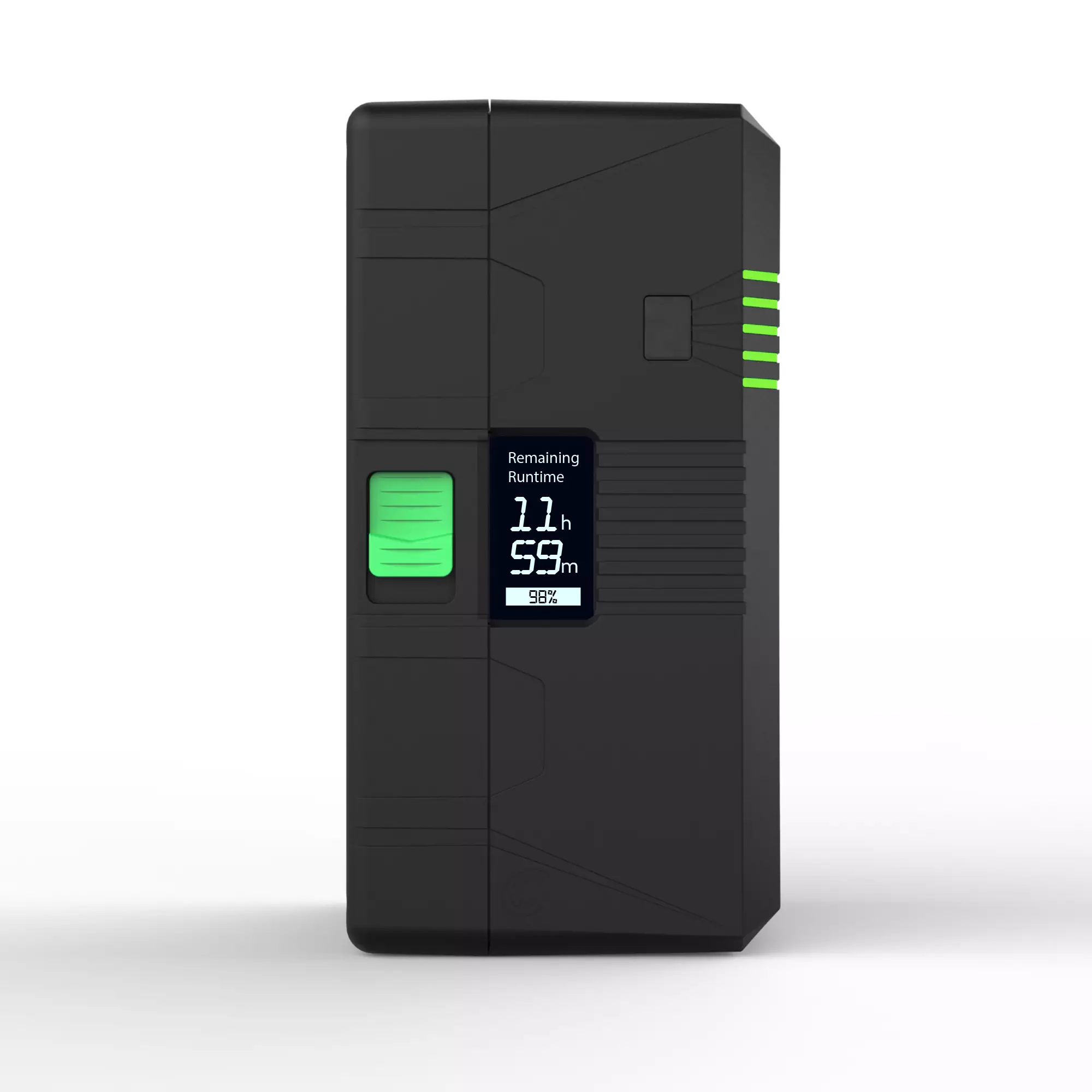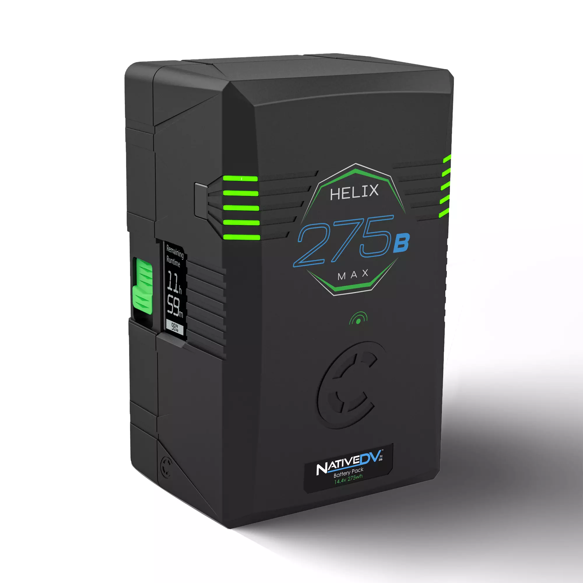 The Helix Max 275 and 360 are equipped with a 3-phase backlit runtime LCD, strategically mounted on the side of the pack, providing the camera operator or grip unparalleled information on battery life and charge status. This advanced LCD is designed to display estimated runtime when the pack is not in use and actual calculated runtime when it is in use by sampling the load every 3 seconds. When placed on a charger, the LCD rotates 90 degrees to display the remaining charge time until the battery is fully charged. Additionally, the LCD displays a bar graph, runtime in hours and minutes, and remaining percentage capacity, allowing filmmakers and lighting professionals to make informed decisions about their power management strategy.