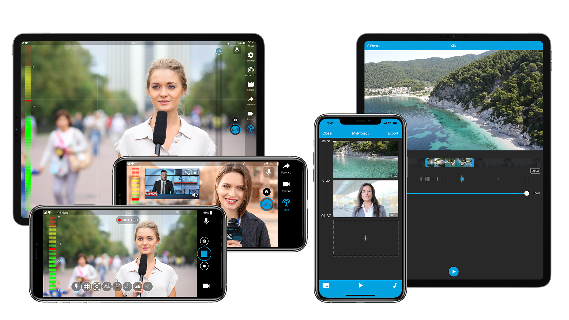 The MoJoPro iOS and Android app enables mobile journalists to broadcast HD video live from the field as well as record, edit, and forward video clips.