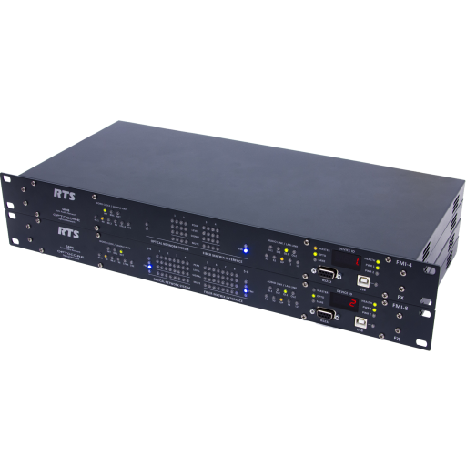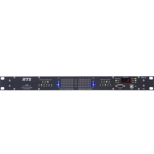 The FMI-8 is a multiplexer featuring eight RTS compatible four-wire intercom ports with keypanel data, Ethernet ports for OMNEO, along with serial data links on DB9 connectors for communication between intercom matrices and auxiliary devices.