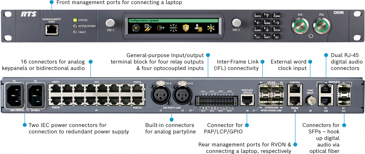 Featuring connectors for AIO, OMNEO and two-wire technology, ODIN supports keypanel technology going forward and, as always, RTS legacy keypanels. OMNEO is standard on RJ-45 connectors or is available using optional Optical Fiber SFP connectors.