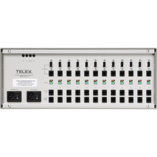 The TIF-4000 is a frame that can house up to twelve digital telephone interface cards (TIF-4000 front cards), with a redundant power supply designed to be compatible with ADAM, ADAM-CS, Cronus and Zeus intercom systems. It provides bidirectional communication between the intercom matrix and an analog telephone line. It allows the phone to access all cross points of the matrix, as well as dynamic party lines, IFB circuits, and other forms of communications. The TIF-4000 supports worldwide telephone standards, ensuring smooth communication across the globe. The 4RU TIF-4000 frame provides a transparent link to the telephone system enabling full dial-out capability from any designated keypanel with keypad. The TIF-4000 also has full dial-in capability giving the caller a keypanel on the system via commands from the DTMF pad on their telephone.