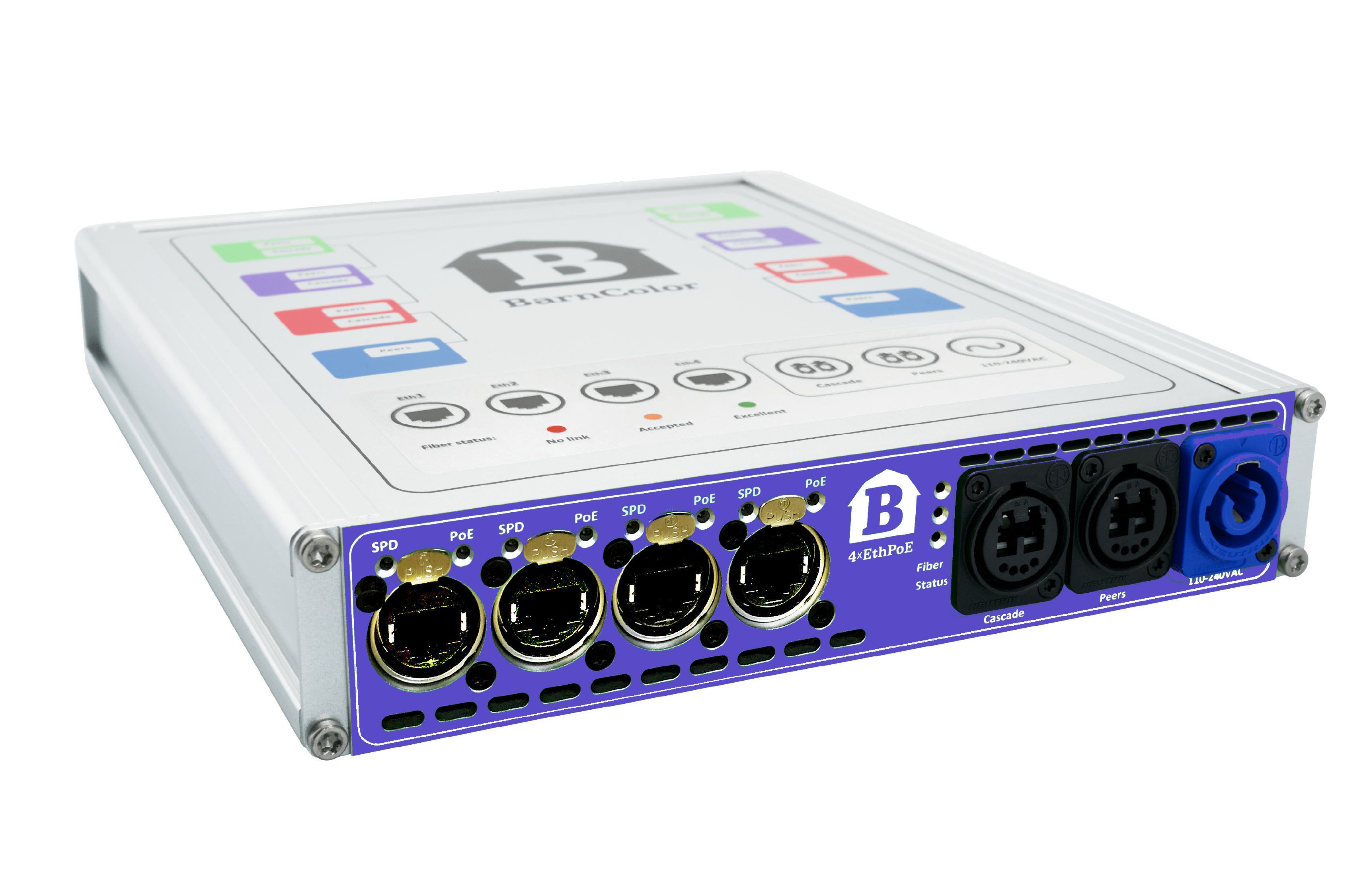 Designed to be a cost-effective and easy-to-deploy solution for transmitting multiple ethernet signals both directions on a single fiber cable. BarnColor allows you to handle up to 16 separate 1Gbit links. Each BarnColor device handles up to 4 separate 1Gbit links and up to 4 different colors of BarnColors can be daisy chained. This flexible system is easy to install, upgrade and use. It is well suited for both fixed and temporary installations.